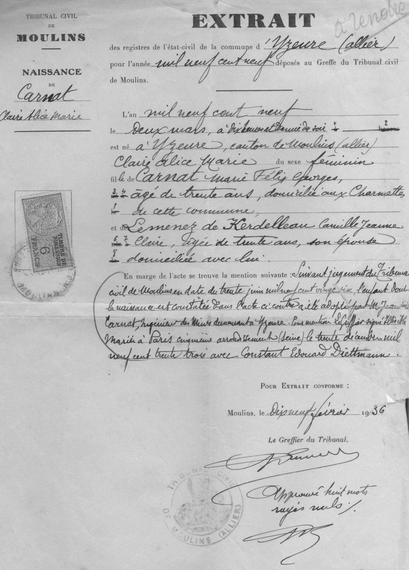 De son vrai nom, CLAIRE, ALICE, MARIE CARNAT, née le 02 Mars 1909 à Yzeure ( Allier ), ( de , Marie, Felix , Georges Carnat et de Camille, Jeanne, Claire Lemenez de Kerdelleau (1) ). Décédée le 15 Décembre 1953 à Garnat sur Engièvre ( Allier ).