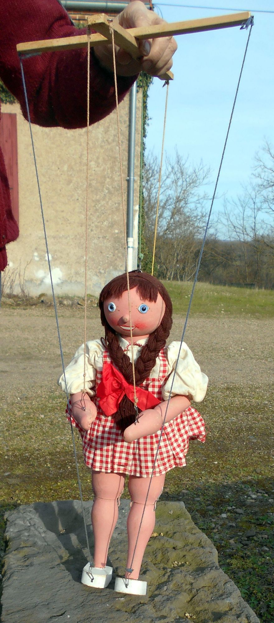 MARION marionnette Claire Carnat créée pour les petites filles, en enlevant la croix, elles peuvent s'en servir comme d'une poupée.( cliquez sur la photo )